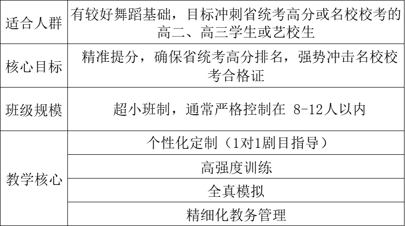 本班以“精准培养、拔尖突破”为核心,旨在通过小班化、军事化、个性化的教学模式,系统提升学生的专业素养与应试能力,核心目标是确保学员在激烈的艺考竞争中脱颖而出,不仅仅是通过考试,更是要考出优势、考出高分。