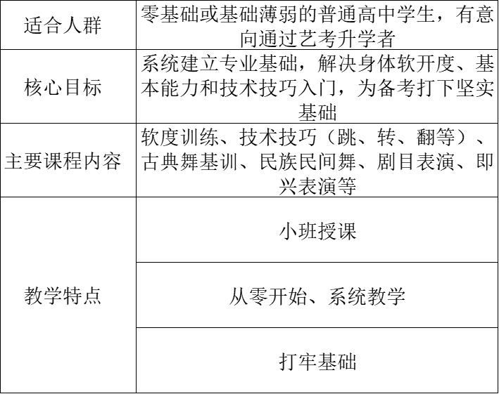 基础班是为准备参加舞蹈专业高考的学生,特别是零基础或基础较薄弱的同学设置的入门课程,旨在系统性地打造必备的专业基本功。
