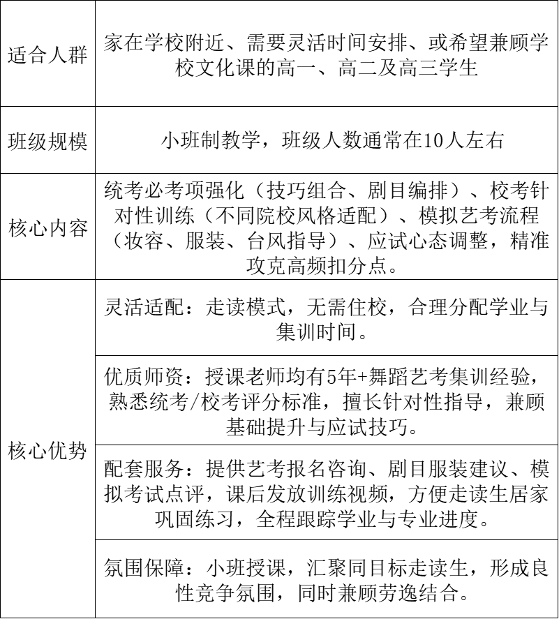 走读班专为兼顾学业与艺考的舞蹈生定制,无需住校,灵活适配日常作息,聚焦统考/校考核心考点,以“高效集训+精准提升”为核心,兼顾基础夯实与应试冲刺,助力走读生在有限时间内突破专业瓶颈,斩获艺考佳绩。